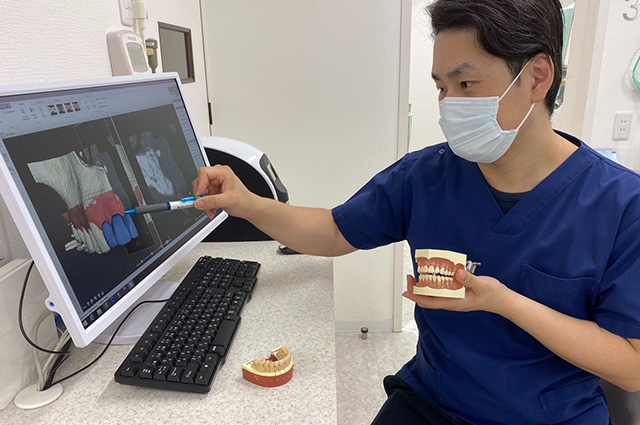まずはお話しを伺い現在の病状やお悩みについてお伺いいたします。当院では説明を重要視していますのでお口の中の写真やレントゲン、口腔内スキャナー(アイテロ)を用いて説明をいたします。